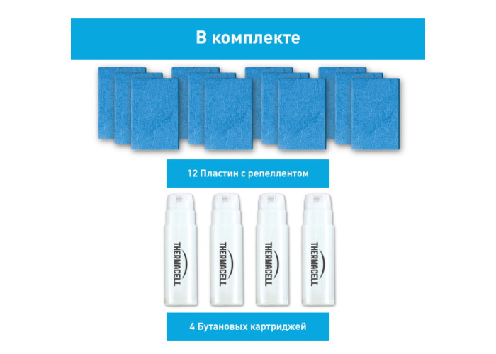 В комплект входит 12 пластин с репеллентом и 4 газовых картриджа. Время суммарной защиты от комаров – 48 часов.